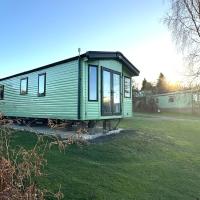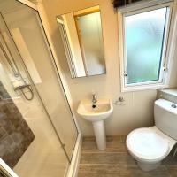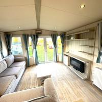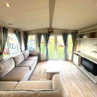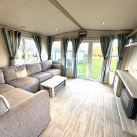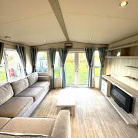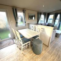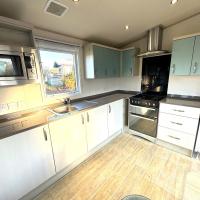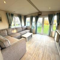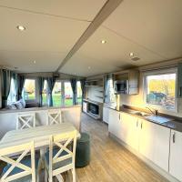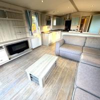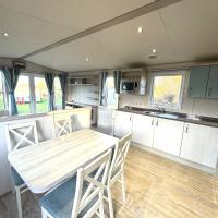 The lounge with its large front windows and patio doors is flooded with light, creating a bright and inviting space to kick back and relax on the L-shaped wraparound sofa.  The lounge benefits from a coffee table, modern electric fire, media wall and TV unit with ample storage.  The open-plan layout of this holiday caravan leads seamlessly from the lounge to the dining and kitchen area.